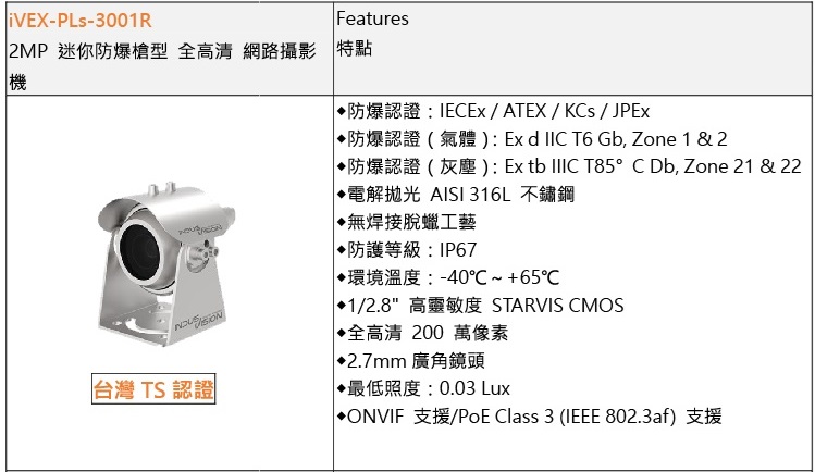 iVEX-PLs-3001R (2MP 迷你防爆槍型 全高清 網路攝影機)