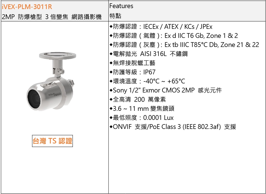iVEX-PLM-3011RA (2MP 防爆槍型 3倍變焦 網路攝影機)